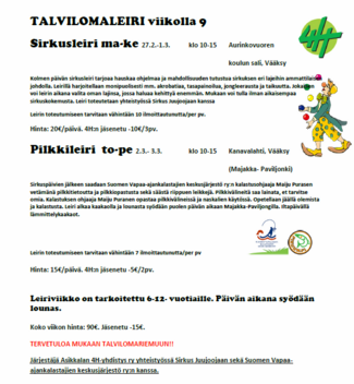 Helmi-maaliskuussa tiistaisin järjestetään perhesirkus (4krt), mikäli ilmoittautuneita tulee tarpeeksi. Ikärajaton.